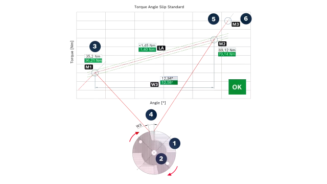 - During the rotation of this torsion shaft by the tightening tool, two torque values, the angle of rotation between the fixed stops, and the linearity of the torque curve are checked.